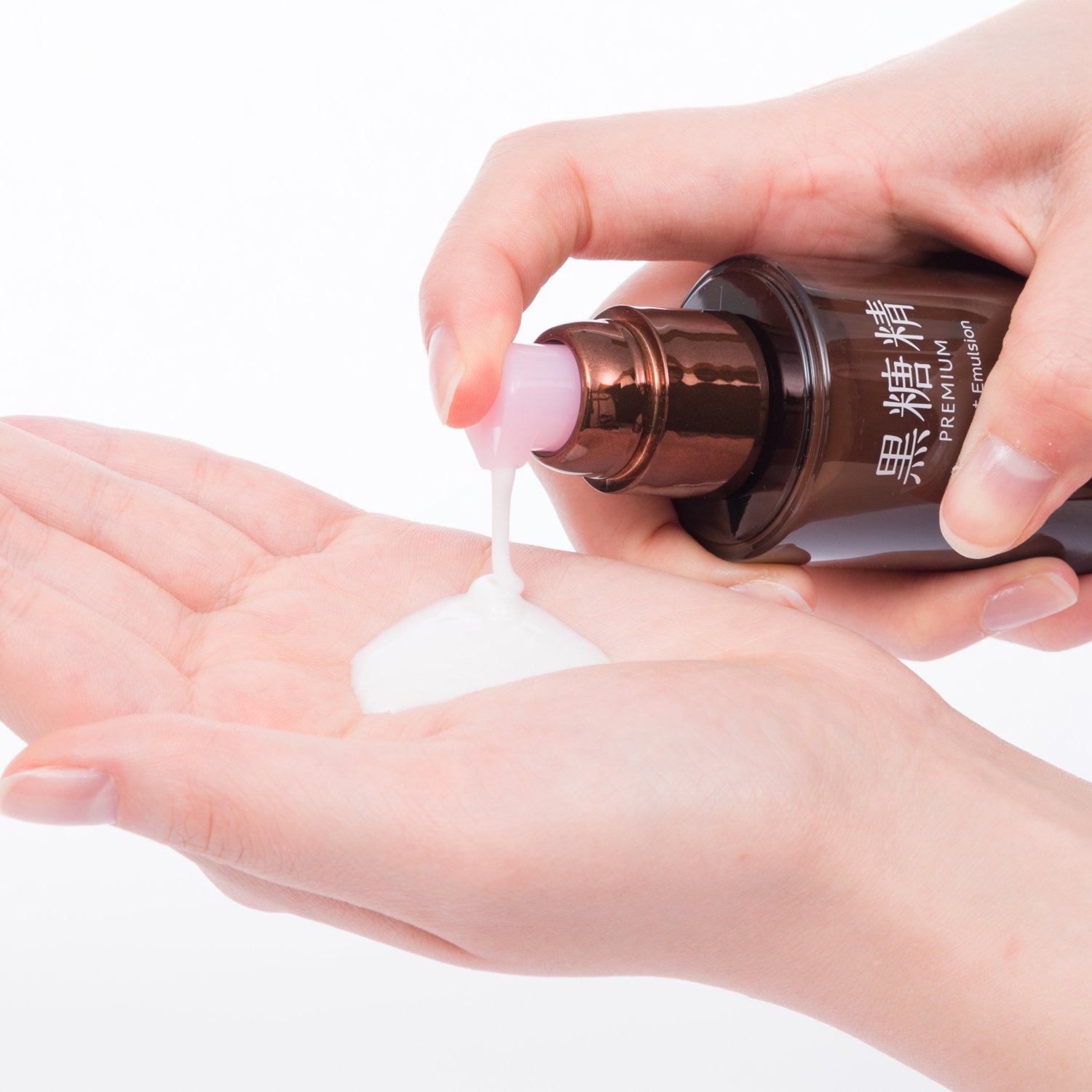 黒糖発酵エキスX5種のボタニカル潤いヴェール成分の力でベタつかないのに超しっとり、やわらか肌が持続する濃厚保湿乳液。プレミアムなうるおいで、やわらかな肌に。